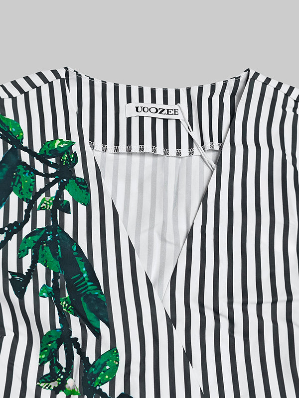 A-Line Loose Asymmetric Split-Joint Striped V-Neck Maxi Dresses Shirt Dress