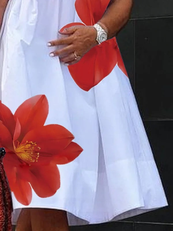 A-Line Loose Flower Print Pleated V-Neck Midi Dresses